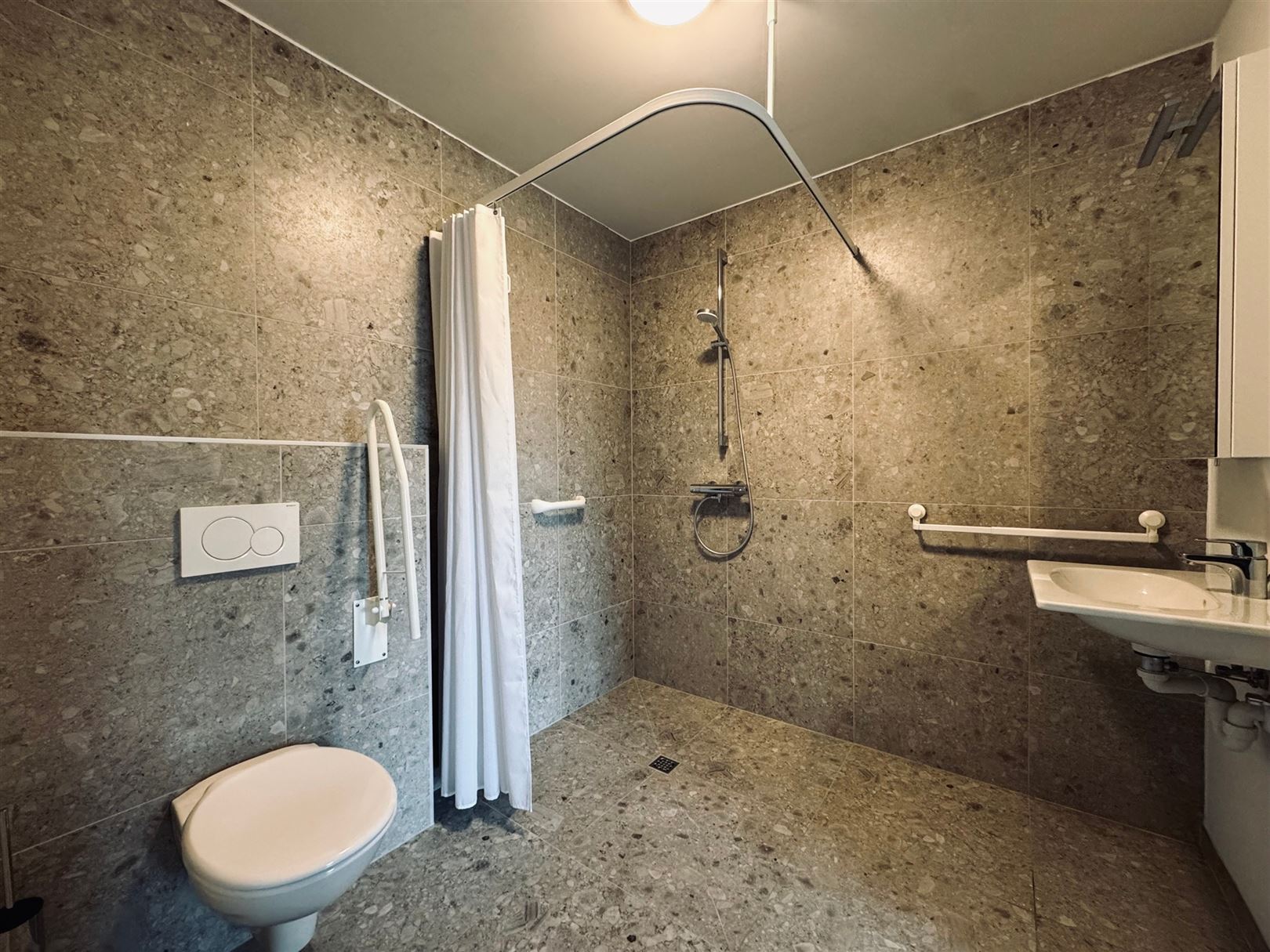 De flat is volledig afgewerkt met kwalitatieve duurzame en onderhoudsvriendelijke materialen en is natuurlijk volledig aangepast aan de noden van rolstoelgebruikers.