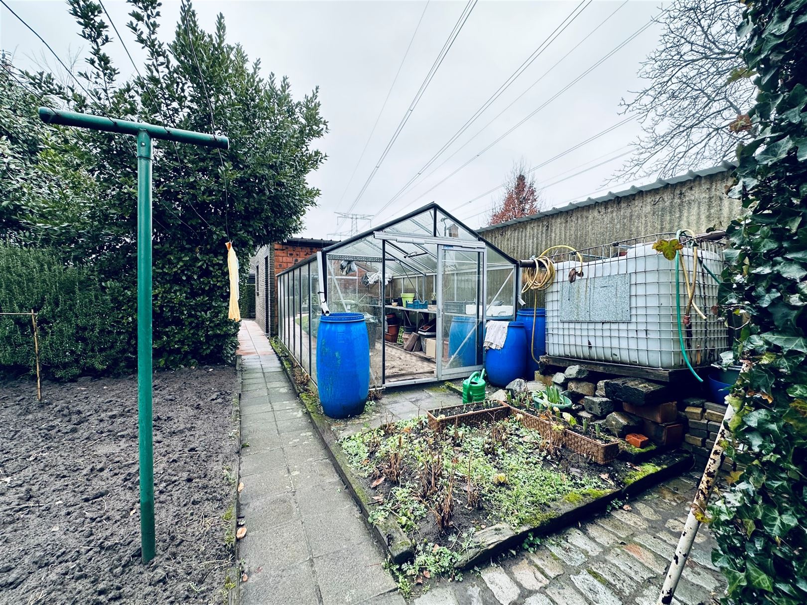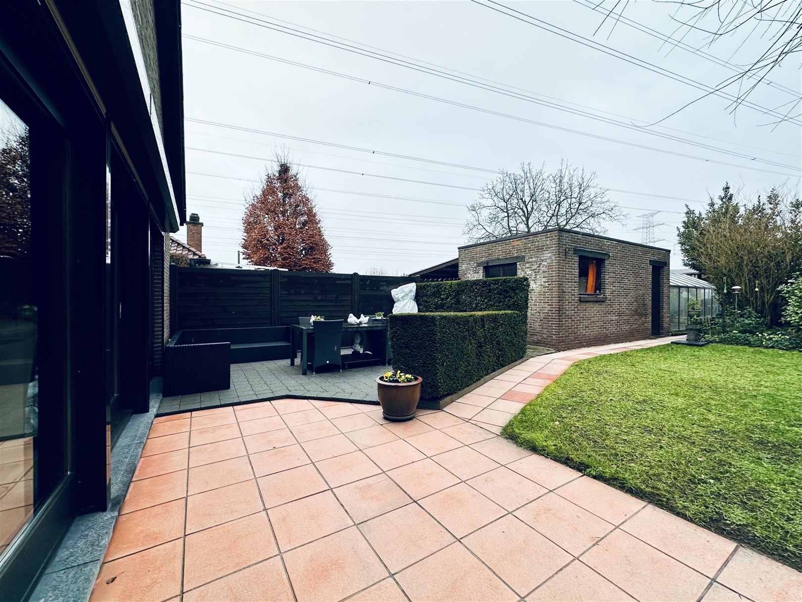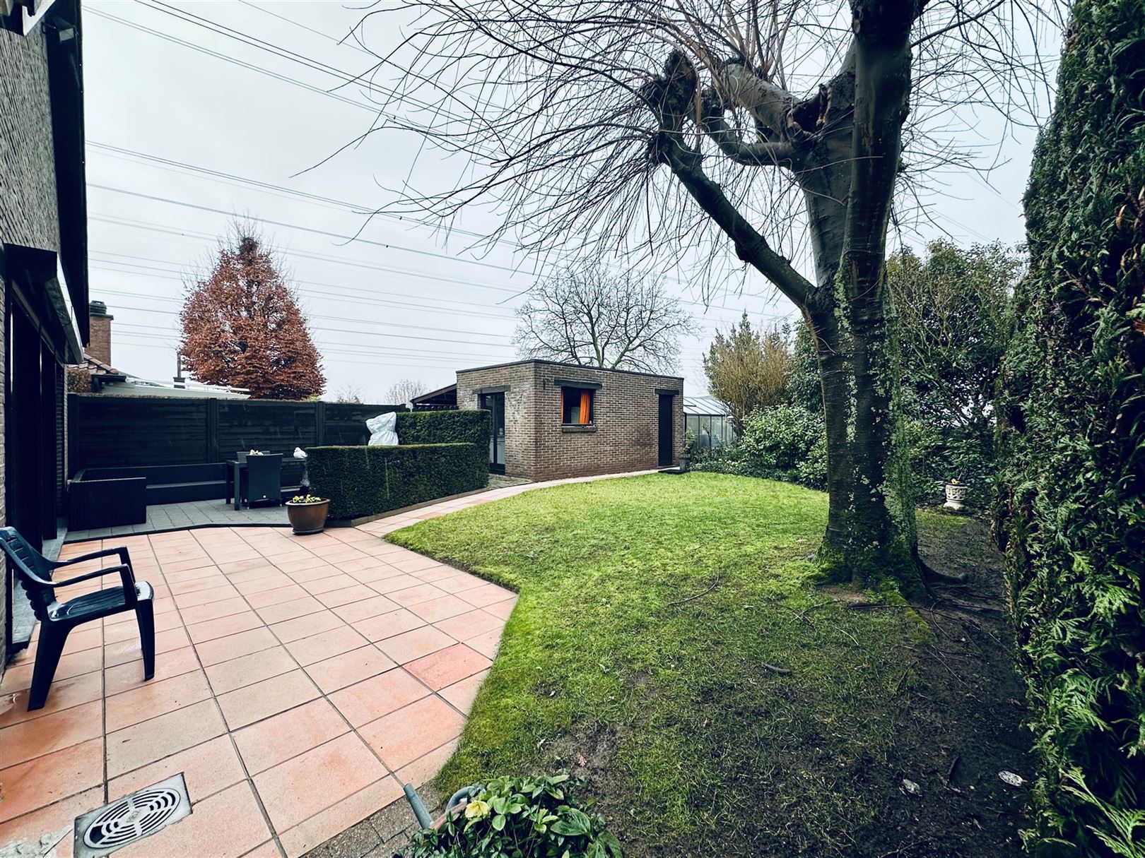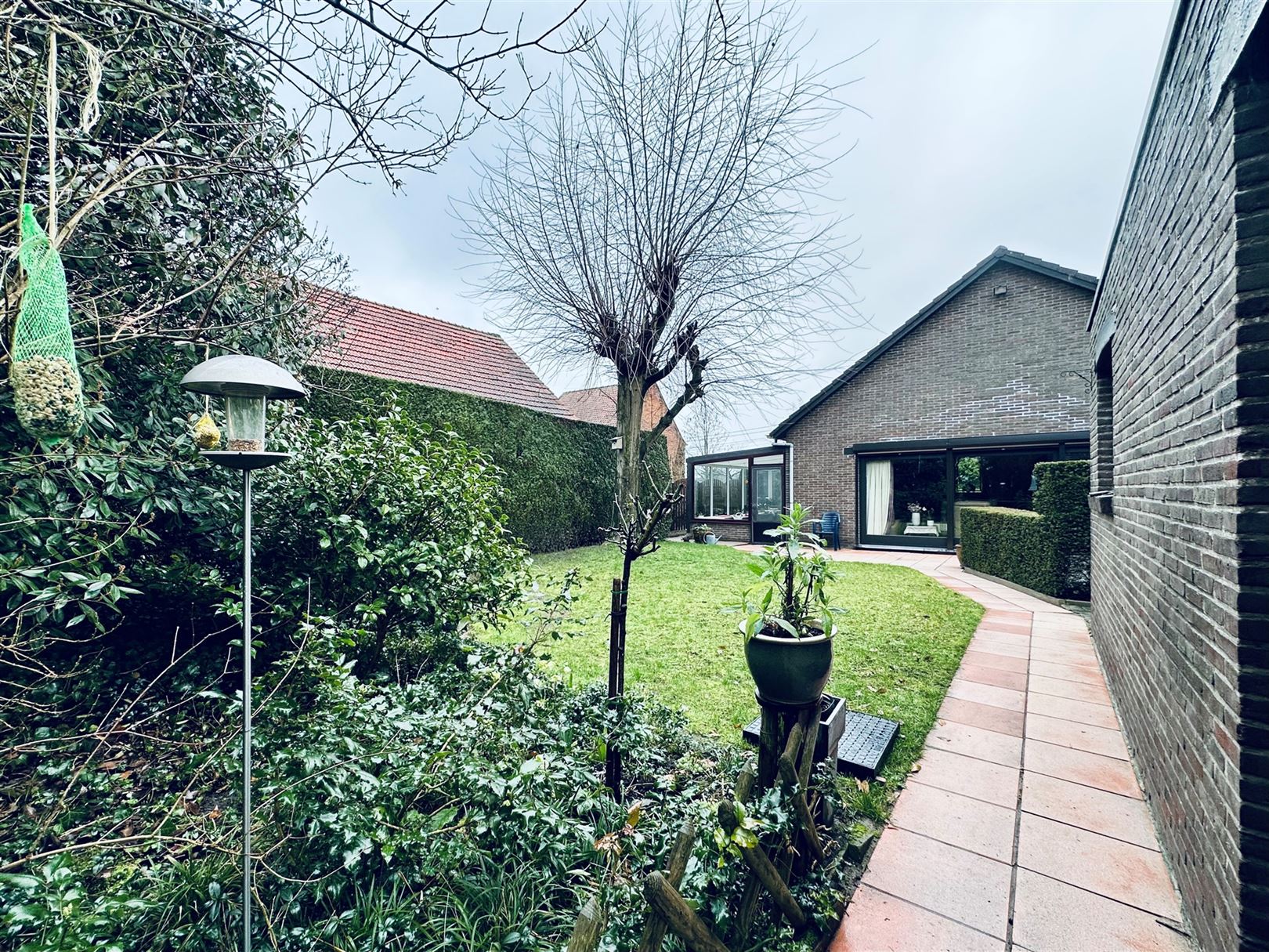 De lange oprit biedt enerzijds toegang tot de overdekte autostaanplaats, anderzijds veel niet overdekte parkeermogelijkheden en verleent uiteraard toegang tot de voordeur.