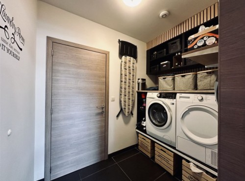 De indeling van deze woning is als volgt: U betreedt het pand via de inkomhal met vestiairemogelijkheden en gastentoilet. Verder komt u terecht in de gerenoveerde keuken met aansluitend een praktische berging en toegang tot de garage. De eetkamer en leefruimte hebben rechtstreekse toegang tot de onderhoudsvriendelijke tuin. De vele ramen aan de achterzijde voorziet de woning van veel lichtinval. Eens in de tuin kan u geniete op het aanpalende terras maar ook van het achterliggende overdekte polyvalente ruimte.